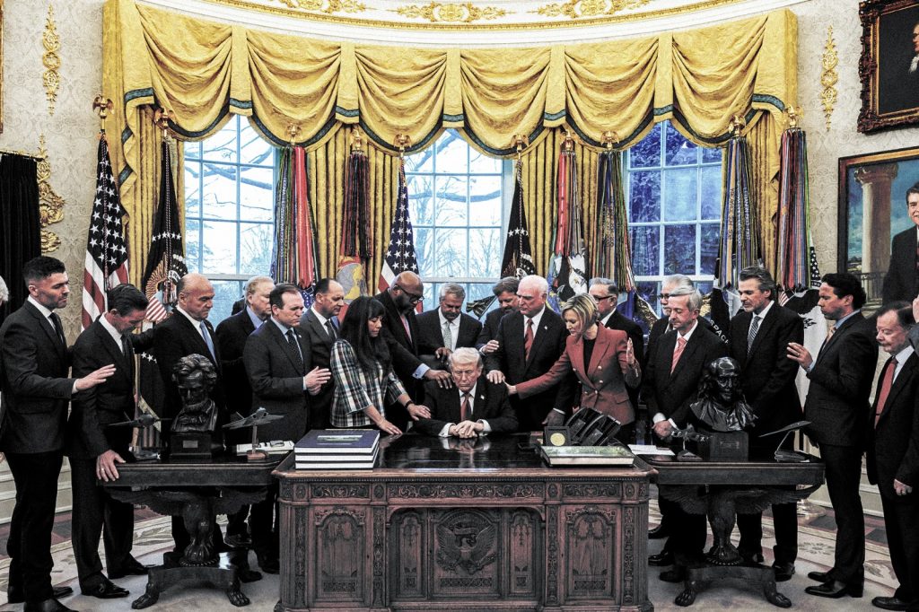 Nedelju dana po početku rata, pozvao je evangelističke lidere u Ovalni kabinet da se mole nad njim i njegovom patetičnom misijom. Svakako ništa ne može izgubiti traženjem božanske pomoći, zato što mu druge pomoći i nema. Ova apsurdna „živa slika” koju su fotografisali podseća na Poslednju večeru.