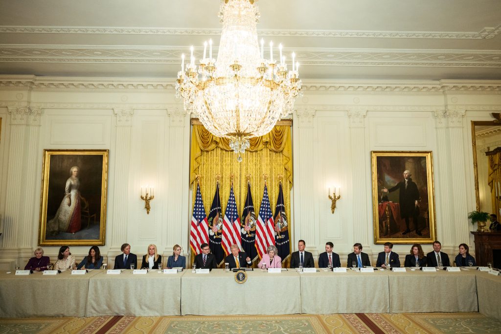 U određenom momentu, rukovodioci su izgubili Trampovu pažnju. Naglo je ustao i došetao do prozora da posmatra napredak renovacija levog krila Bele kuće, projekta vrednog 500 miliona dolara. Predsednik je naručio gradnju balske dvorane koja može da ugosti hiljadu ljudi. Kao Versaj, Bela kuća dobija sopstvenu dvoranu ogledala.