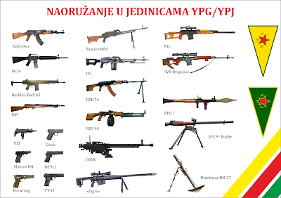 YPG i YPJ su kao jedinice narodne milicije laka pešadija, naoružana lakim pešadijskim naoružanjem. Naoružnje koje koristi YPG jeste ono naoružanje koje se moglo naći u vojnim magacinim sirijske vojske. Pored lakog pešadijskog noružanja, koje je primarno bitno za jedinice YPG-a, u arsenalu postoje i improvizovna vozila kao i improvizovna oklopna vozila.